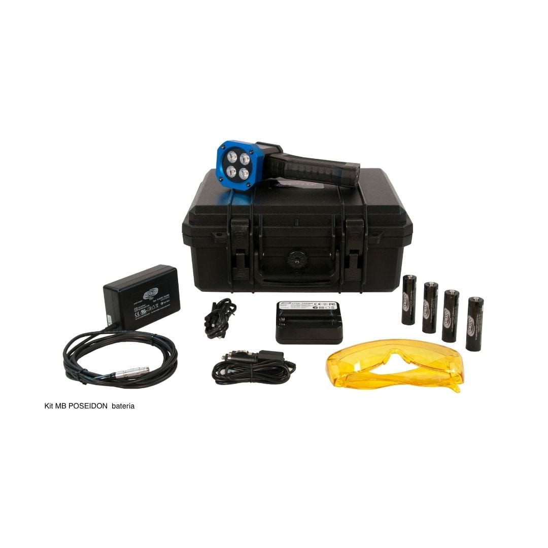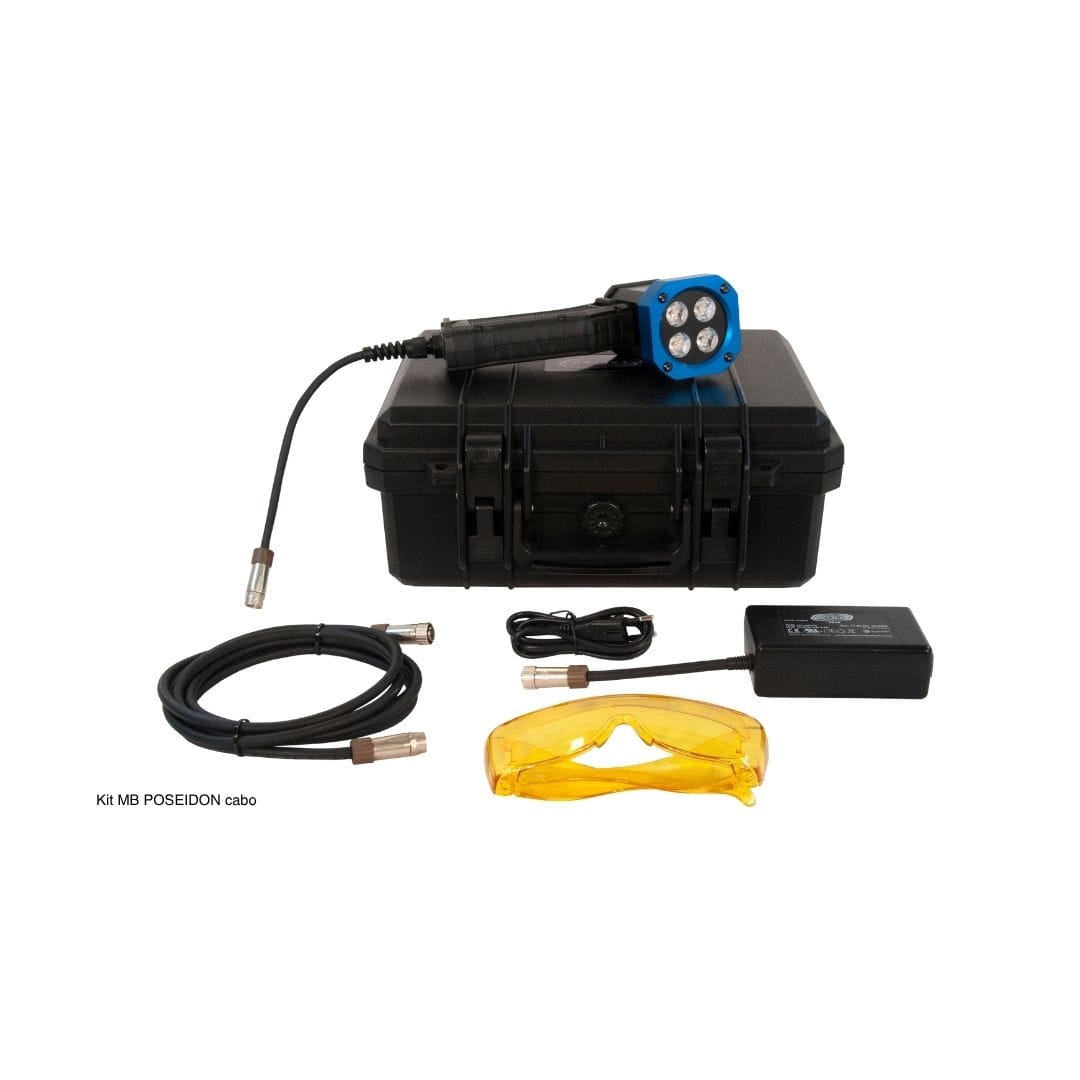 A MB POSEIDON, com luz azul de comprimento de onda de 440 nm, é cada vez mais utilizada em END (Ensaios Não Destrutivos), nos métodos de Líquido Penetrante (LP), Partículas Magnéticas (PM) fluorescentes.